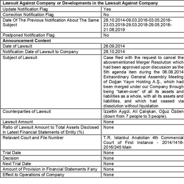 During the Extraordinary General Assembly Meeting of held on 06.08.14, of Doğan Yayın Holding A.Ş., which had ceased via dissolution without liquidation following the merger that took place under our Company, with regards to the lawsuit that was filed with the request to cancel the Merger Resolution, which had been discussed as the 5th Agenda item, and approved, which has constantly been updated via the public disclosures by our Company on various dates, and which has most recently been announced to be rejected and to have concluded in favour of our Company, a sentence has been issued following the application for a post-judgment relief by the claimant, and it has been rejected again. With this verdict, the above-mentioned legal process has been concluded in favor of our Company and the judgment has been finalized.