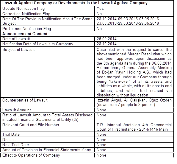 During the processes of the litigation which had been filed with the request to cancel the Merger Resolution which had been approved upon discussion as the 5th agenda item during the 06.08.2014 Extraordinary General Assembly Meeting of Doğan Yayın Holding A.Ş., which had been merged under our Company through being “taken-over” of all its assets and liabilities as a whole, with all its assets and liabilities, and which had ceased via dissolution without liquidation; and which litigation processes are being regularly updated by our Company via public disclosures on various dates, as a result of the most recent appeal application ¬having been rejected by the Court of Cassation in favor of our Company, and as a result of the verdict of the first degree court having been approved, the above mentioned legal process has been concluded in favor of our Company, and the verdict has been finalized.