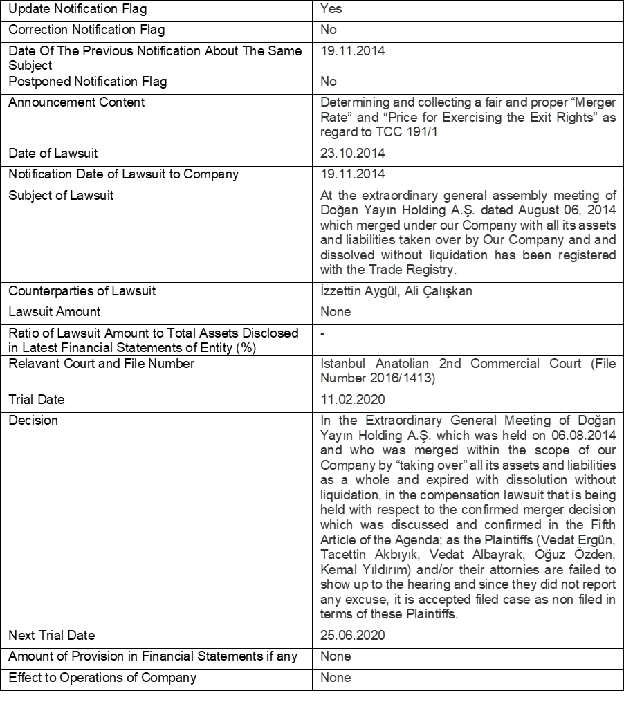 Regarding the court decision as specified above İzzettin Aygül and Ali Çalışkan have remained as suitor at this case. In case of this, public disclosure will be made within the scope of legislation relating to this issue.