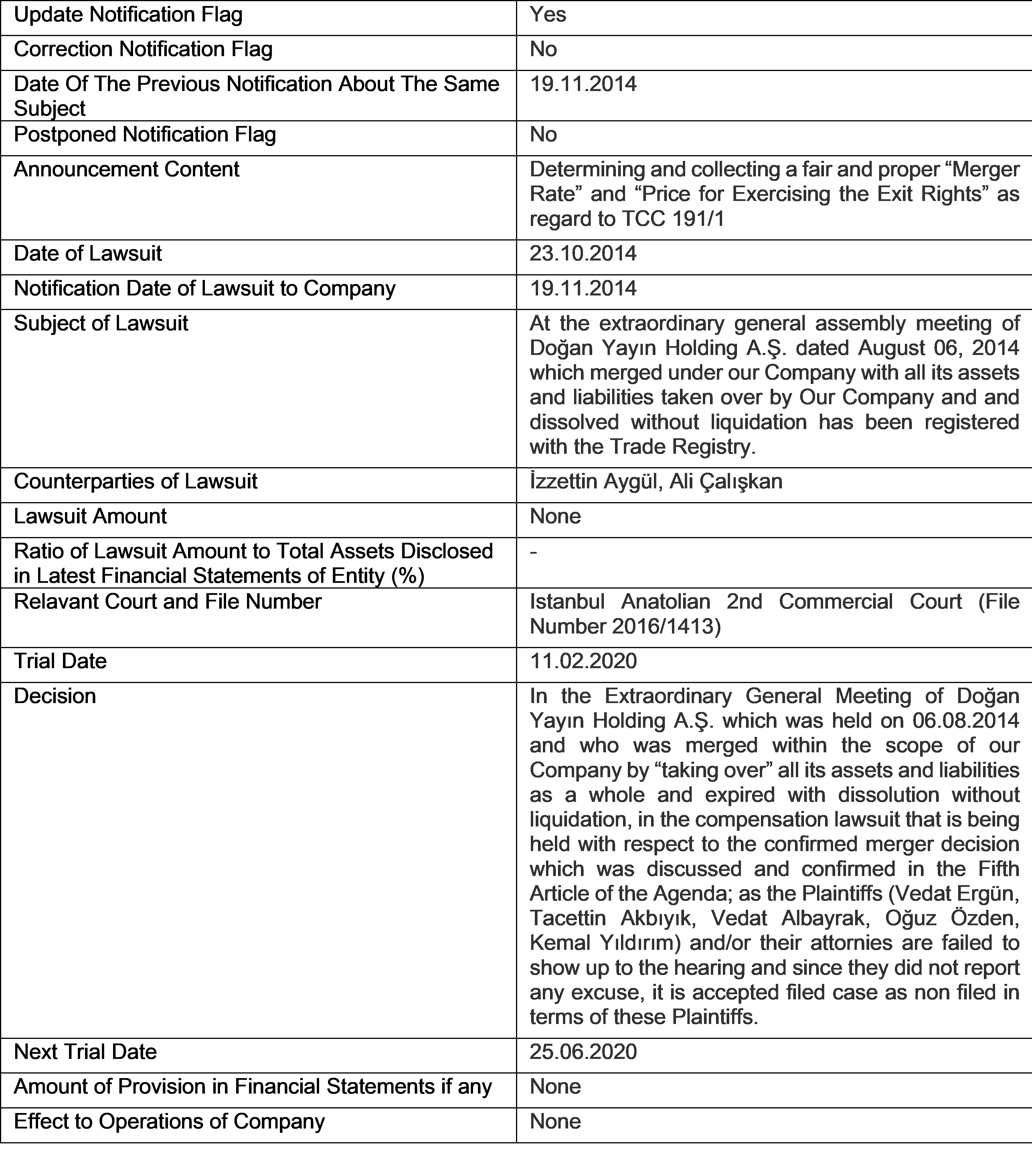 Regarding the court decision as specified above İzzettin Aygül and Ali Çalışkan have remained as suitor at this case. In case of this, public disclosure will be made within the scope of legislation relating to this issue.