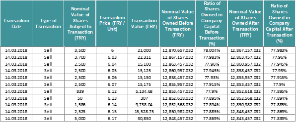 Notification regarding our company’s transactions executed on March 14, 2018 (today) on the shares of our direct subsidiary Çelik Halat ve Tel Sanayii A.Ş. is presented below.