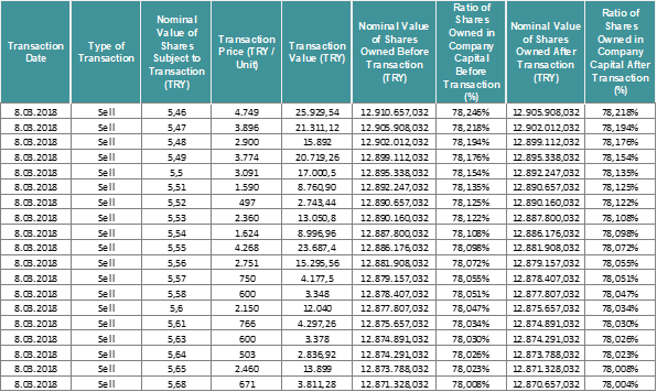 Notification regarding our company’s transactions executed on March 08, 2018 (today) on the shares of our direct subsidiary Çelik Halat ve Tel Sanayii A.Ş. is presented below.