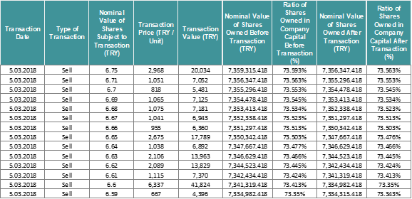 Notification regarding our company’s transactions executed on March 05, 2018 (today) on the shares of our direct subsidiary Ditaş Doğan Yedek Parça İmalat ve Teknik A.Ş. is presented below.
