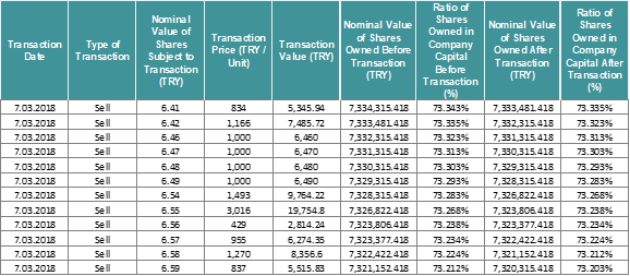 Notification regarding our company’s transactions executed on March 07, 2018 (today) on the shares of our direct subsidiary Ditaş Doğan Yedek Parça İmalat ve Teknik A.Ş. is presented below.