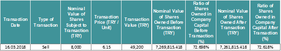 Notification regarding our company’s transactions executed on March 05, 2018 (today) on the shares of our direct subsidiary Ditaş Doğan Yedek Parça İmalat ve Teknik A.Ş. is presented below.