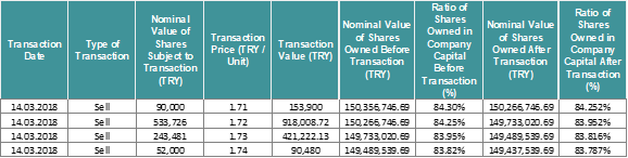 Notification regarding our company’s transactions executed on March 14, 2018 (today) on the shares of our direct subsidiary Milpa Ticari ve Sınai Ürünler Pazarlama Sanayi ve Ticaret A.Ş. is presented below.
