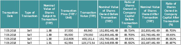 Notification regarding our company’s transactions executed on March 07, 2018 (today) on the shares of our direct subsidiary Milpa Ticari ve Sınai Ürünler Pazarlama Sanayi ve Ticaret A.Ş. is presented below.