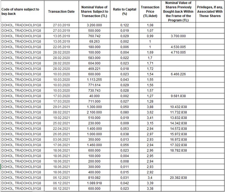 It is evaluated that our financial performance hasn’t been reflected our consolidated operational performance truly based on the current NAV discount and share price formed in the Bourse İstanbul. Within the scope of the “Share Buy-back Program” approved at the Ordinary General Assembly Meeting dated March 20, 2019 our company purchased a total of 2,500,000 shares on December 06, 2021 (today) from Bourse.