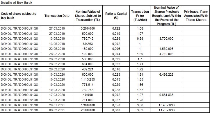 Within the scope of the “Share Buy-back Program” approved at the Ordinary General Assembly Meeting dated March 20, 2019 our company purchased a total of 2,100,000 shares on February 08, 2021 (today) from Bourse.