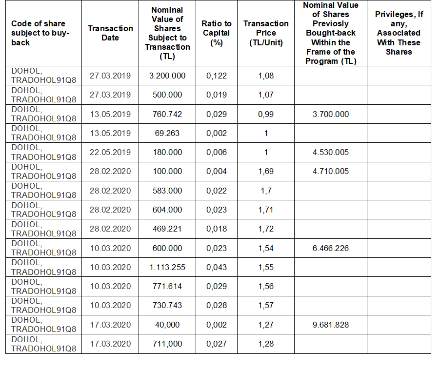Within the scope of the “Share Buy-back Program” approved at the Ordinary General Assembly Meeting dated March 20, 2019 our company purchased a total of 751,000 shares on March 17, 2020 from Bourse.