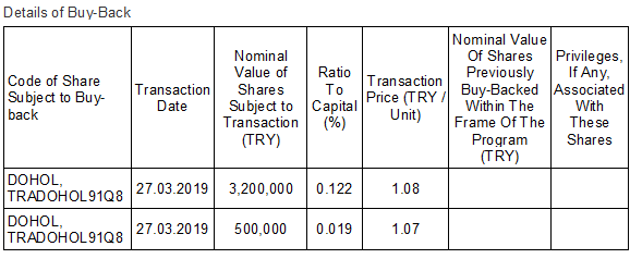 Within the scope of the “Share Buy-back Program” approved at the Ordinary General Assembly Meeting dated March 20, 2019 our company purchased a total of 3,700,000 shares on March 27, 2019 (today) from Bourse.
