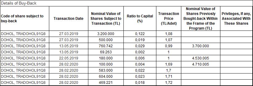 Within the scope of the “Share Buy-back Program” approved at the Ordinary General Assembly Meeting dated March 20, 2019 our company purchased a total of 1,756,221 shares on February 28, 2020 (today) from Bourse.