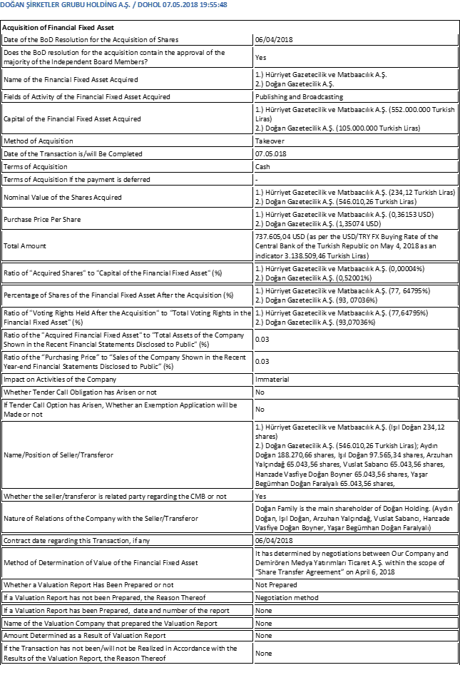 Acquisition of shares within the scope of “Share Transfer Agreement” signed between our Company and Demirören Medya Yatırımları Ticaret A.Ş. on April 6, 2018. The mentioned shares will be transferred to Demirören Medya Yatırımları Ticaret A.Ş. after “Closing” as specified in the “Share Transfer Agreement”