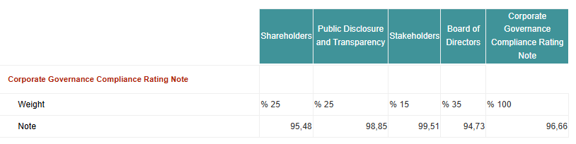 In line with the CMB's related resolution, the final rating is determined based on a weighted average of four sub-categories. The breakdown of our Corporate Governance Rating by sub-category is presented below.