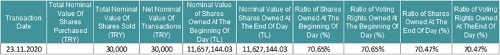 30,000 shares of our direct subsidiary Çelik Halat ve Tel Sanayii A.Ş. were sold by our company from the price range of TL 19.75 – 20.34 (weighted average price TL 19.86). Together with this transaction our company’s share has become to 70.47% as of November 23, 2020 (today). Notification regarding this transaction is presented below.