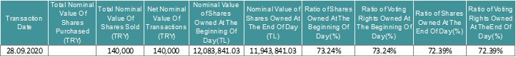 140,000 shares of our direct subsidiary Çelik Halat ve Tel Sanayii A.Ş. were sold by our company from the price range of 12.53 – 12.94 (weighted average price TL 12.59). Together with this transaction our company’s share has become to 72.39% as of September 28, 2020 (today). Notification regarding this transaction is presented below.