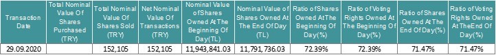 152,105 shares of our direct subsidiary Çelik Halat ve Tel Sanayii A.Ş. were sold by our company from the price range of 12.55 – 12.74 (weighted average price TL 12.59). Together with this transaction our company’s share has become to 71.47% as of September 29, 2020 (today). Notification regarding this transaction is presented below.