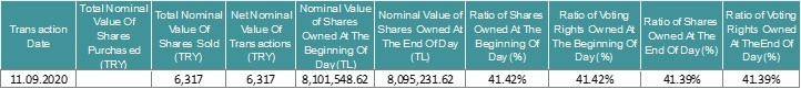6,317 shares of our joint venture Doğan Burda Dergi Yayıncılık ve Pazarlama A.Ş. were sold by our company from the price of 23.70. Together with this transaction our company’s share has become to 41.39% as of September 11, 2020 (today). Notification regarding this transaction is presented below.