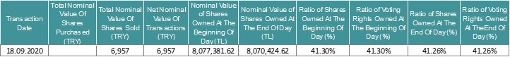 6,957 shares of our joint venture Doğan Burda Dergi Yayıncılık ve Pazarlama A.Ş. were sold by our company from the price of TL 20.34. Together with this transaction our company’s share has become to 41.26% as of September 18, 2020 (today). Notification regarding this transaction is presented below.