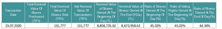 131,777 shares of our joint venture Doğan Burda Dergi Yayıncılık ve Pazarlama A.Ş. were sold by our company from the price range of 20.48 – 21.74. Together with this transaction our company’s share has become to 44.34% as of July 23, 2020 (today). Notification regarding this transaction is presented below.
