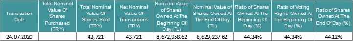 43,721 shares of our joint venture Doğan Burda Dergi Yayıncılık ve Pazarlama A.Ş. were sold by our company from the price range of 20.02 – 20.88. Together with this transaction our company’s share has become to 44.12% as of July 24, 2020 (today). Notification regarding this transaction is presented below.