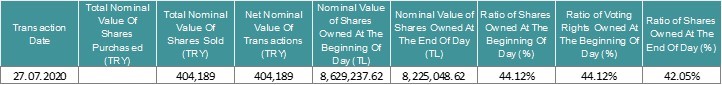 404,189 shares of our joint venture Doğan Burda Dergi Yayıncılık ve Pazarlama A.Ş. were sold by our company from the price range of 19.90 – 21.46. Together with this transaction our company’s share has become to 42.05% as of July 27, 2020 (today). Notification regarding this transaction is presented below.
