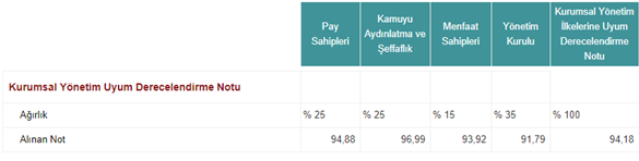 Türkiye'de Sermaye Piyasası Kurulu ("SPK") Kurumsal Yönetim İlkeleri'ne uygun olarak derecelendirme yapmak üzere faaliyet izni bulunan, derecelendirme kuruluşu SAHA Kurumsal Yönetim ve Kredi Derecelendirme Hizmetleri A.Ş. ("Saha"), kurumsal yönetim derecelendirme notumuzu 10 üzerinden 9,42 (%94,18)' ye yükseltmiştir. SPK'nın konuya ilişkin ilke kararı çerçevesinde, nihai derecelendirme notu dört alt kategorinin farklı şekilde ağırlıklandırılması ile belirlenmektedir. Bu kapsamda, kurumsal yönetim derecelendirme notumuzun alt kategoriler itibariyle dağılımı aşağıda verilmektedir.