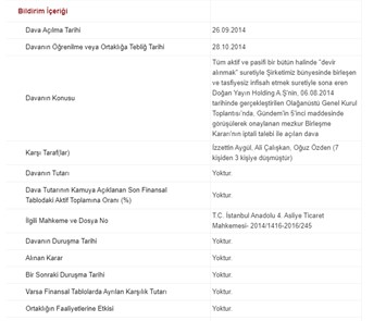Şirket'imiz bünyesinde gerçekleşen birleşme işlemi sonucunda, tasfiyesiz infisah etmek suretiyle sona eren Doğan Yayın Holding A.Ş'nin, 06.08.2014 tarihinde gerçekleştirilen Olağanüstü Genel Kurul Toplantısı'nda, Gündem'in 5'inci maddesinde görüşülerek onaylanan Birleşme Kararı'nın iptali talebi ile açılan ve muhtelif tarihlerde Şirket'imiz tarafından kamuya yapılan açıklamalar ile sürekli güncellenen ve en son davanın reddedilerek Şirket'imiz lehine sonuçlandığı açıklanan davada; davacının karar düzeltme başvurusu hakkında da hüküm oluşturularak tekrar reddine karar verilmiştir. Bu karar ile birlikte bahse konu hukuki süreç Şirket'imiz lehine sonuçlanmış ve karar kesinleşmiştir.