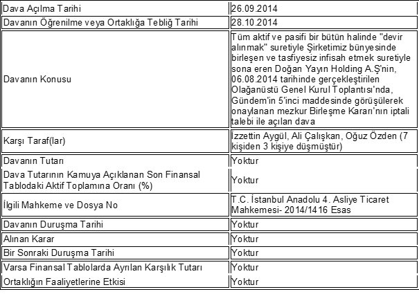 Mezkur Birleşme İşlemi sonucunda tasfiyesiz infisah etmek suretiyle sona eren Doğan Yayın Holding A.Ş'nin, 06.08.2014 tarihinde gerçekleştirilen Olağanüstü Genel Kurul Toplantısı'nda, Gündem'in 5'inci maddesinde görüşülerek onaylanan Birleşme Kararı'nın iptali talebi ile açılan Dava'nın 9 Mart 2016 tarihinde yapılan duruşmasında; Karşı Taraflar'ın (Davacıların), talepleri İlgili Mahkeme tarafından red edilmiştir. Davacılar'ın söz konusu Mahkeme Kararı'nı temyiz ettikleri 03.05.2016 tarihli Özel Durum Açıklamamız vasıtasıyla daha önce kamuya duyurulmuştu.