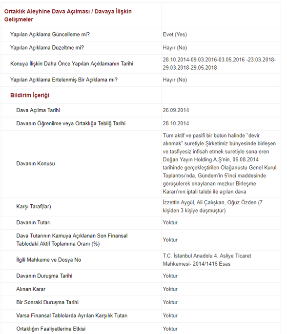 Şirketimiz bünyesinde gerçekleşen birleşme işlemi sonucunda, tasfiyesiz infisah etmek suretiyle sona eren Doğan Yayın Holding A.Ş'nin, 06.08.2014 tarihinde gerçekleştirilen Olağanüstü Genel Kurul Toplantısı'nda, Gündem'in 5'inci maddesinde görüşülerek onaylanan Birleşme Kararı'nın iptali talebi ile açılan ve muhtelif tarihlerde Şirketimiz tarafından kamuya yapılan açıklamalar ile sürekli güncellenen dava süreçlerinde, son olarak yapılan temyiz başvurusunun da Yargıtay tarafından Şirketimiz lehine red edilmesi ve ilk derece mahkemesinin kararının onanması neticesinde, bahse konu hukuki süreç Şirketimiz lehine sonuçlanmış ve karar kesinleşmiştir.