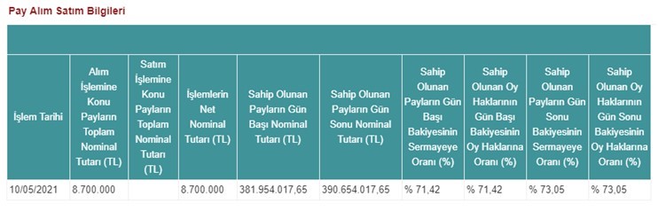 Yönetim Kurulumuz'un 28.04.2021 tarihli Kararı ile belirlenen hisse alım limitinin tamamlanması nedeniyle alınan ilave yetkilendirme dahilinde Şirketimiz, doğrudan bağlı ortaklığı Galata Wind Enerji A.Ş. hisselerinde 10.05.2021 (bugün) tarihinde, 4,52 - 4,83 TL fiyat aralığından (ağırlıklı ortalama fiyat 4,77 TL) 8.700.000 adet alış işlemi gerçekleştirmiştir. Bu işlem ile birlikte Galata Wind Enerji A.Ş. sermayesindeki payımız 10.05.2021 (bugün) tarihi itibariyle %73,05 olmuştur. Yapmış olduğumuz işlemlere ilişkin tablo aşağıda yer almaktadır;