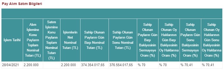 Şirketimiz, doğrudan bağlı ortaklığı Galata Wind Enerji A.Ş. hisselerinde 28.04.2021 tarihinde, 4,82 - 4,95 TL fiyat aralığından (ağırlıklı ortalama fiyat 4,89 TL) 2.200.000 adet alış işlemi gerçekleştirmiştir. Bu işlem ile birlikte Galata Wind Enerji A.Ş. sermayesindeki payımız 28.04.2021 tarihi itibariyle %70,41 olmuştur. Yapmış olduğumuz işlemlere ilişkin tablo aşağıda yer almaktadır;