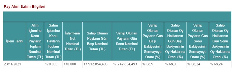 Şirketimiz, doğrudan bağlı ortaklığı Ditaş Doğan Yedek Parça İmalat ve Teknik A.Ş. hisselerinde 23.11.2021 (bugün) tarihinde, 30,00 - 30,48 TL fiyat aralığından (ağırlıklı ortalama fiyat 30,2669 TL) 170.000 adet satış işlemi gerçekleştirmiştir. Bu işlem ile birlikte Ditaş Doğan Yedek Parça İmalat ve Teknik A.Ş. sermayesindeki payımız 23.11.2021 (bugün) tarihi itibariyle %68,24 olmuştur. Yapmış olduğumuz işlemlere ilişkin tablo aşağıda yer almaktadır;