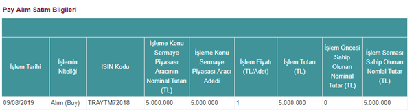 Şirketimiz'in sermayesinin tamamına sahip olduğu Doğan Enerji Yatırımları Sanayi ve Ticaret A.Ş.'nin, tamamı ödenmiş 636.000.000 Türk Lirası sermayesinde %50 oranında doğrudan pay sahibi olduğu dolaylı bağlı ortaklığımız Aytemiz Akaryakıt Dağıtım A.Ş.'nin; 09 Ağustos 2019 tarihinde (bugün), 350 gün vadeli, 3 aylık TRLIBOR+%1,50 yıllık basit faiz oranı (1'inci kupon dönemsel faiz oranı %5,0847) referans alınmak suretiyle hesaplanan, üç ayda bir faiz ödemeli kuponlu finansman bonosu ihracı gerçekleştirdiği; ihraç tutarının toplam nominal değerinin 50.000.000 Türk Lirası ve 1,00 Türk Lirası itibari değerli olduğu; ihraç edilecek finansman bonolarının çoğunluğunun (%90) satışının Doğan Grubu dışındaki şirketlere yapıldığı görülerek;