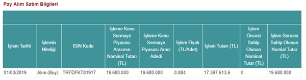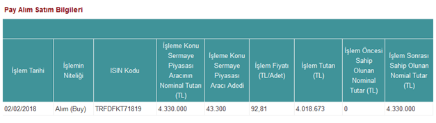 Şirketimiz'in tamamı ödenmiş 40.000.000 Türk Lirası sermayesinde %94,89 oranında pay sahibi olduğu doğrudan bağlı ortaklığımız Doruk Faktoring A.Ş.'nin, 02 Şubat 2018 tarihinde (bugün) halka arz edilmeksizin nitelikli yatırımcılara Borsa İstanbul A.Ş. dışında ihraç ve satışını gerçekleştirdiği 174 gün vadeli, beher iskontolu satış fiyatı 92,81-Türk Lirası olan (100,00- Türk Lirası itibari değerli) finansman bonolarından, 4.018.673,-Türk Lirası karşılığında, 4.330.000,-Türk Lirası nominal değerde 43.300 adet alınmasına karar verilmiştir. Alım fiyatı, işbu ihraçta alım yapan diğer 3'üncü kişilerin alım fiyatları ile aynıdır.
