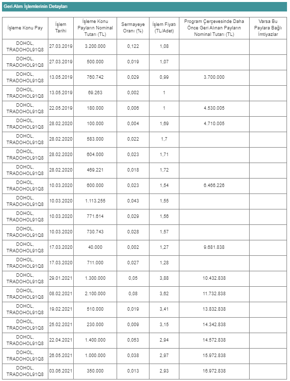 Şirketimiz 20 Mart 2019 tarihli Olağan Genel Kurul Toplantısında onaylanan "Pay Geri Alım Programı" kapsamında 3 Haziran 2021 tarihinde 350.000 adet kendi payını Borsa'dan satın almıştır.