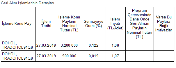 Şirketimiz 20 Mart 2019 tarihli Olağan Genel Kurul Toplantısında onaylanan "Pay Geri Alım Programı" kapsamında 27.03.2019 tarihinde (bugün) 3.700.000 adet kendi payını Borsa'dan satın almıştır.