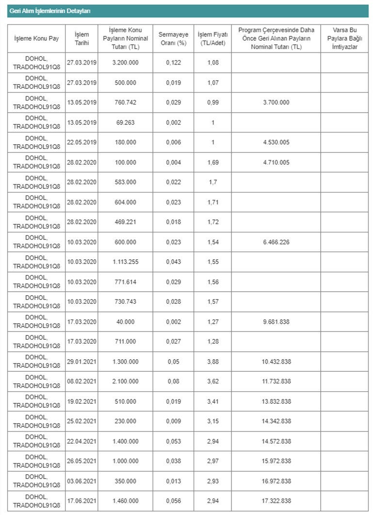 Şirketimiz 20 Mart 2019 tarihli Olağan Genel Kurul Toplantısında onaylanan "Pay Geri Alım Programı" kapsamında 17 Haziran 2021 tarihinde (bugün) 1.460.000 adet kendi payını Borsa'dan satın almıştır.