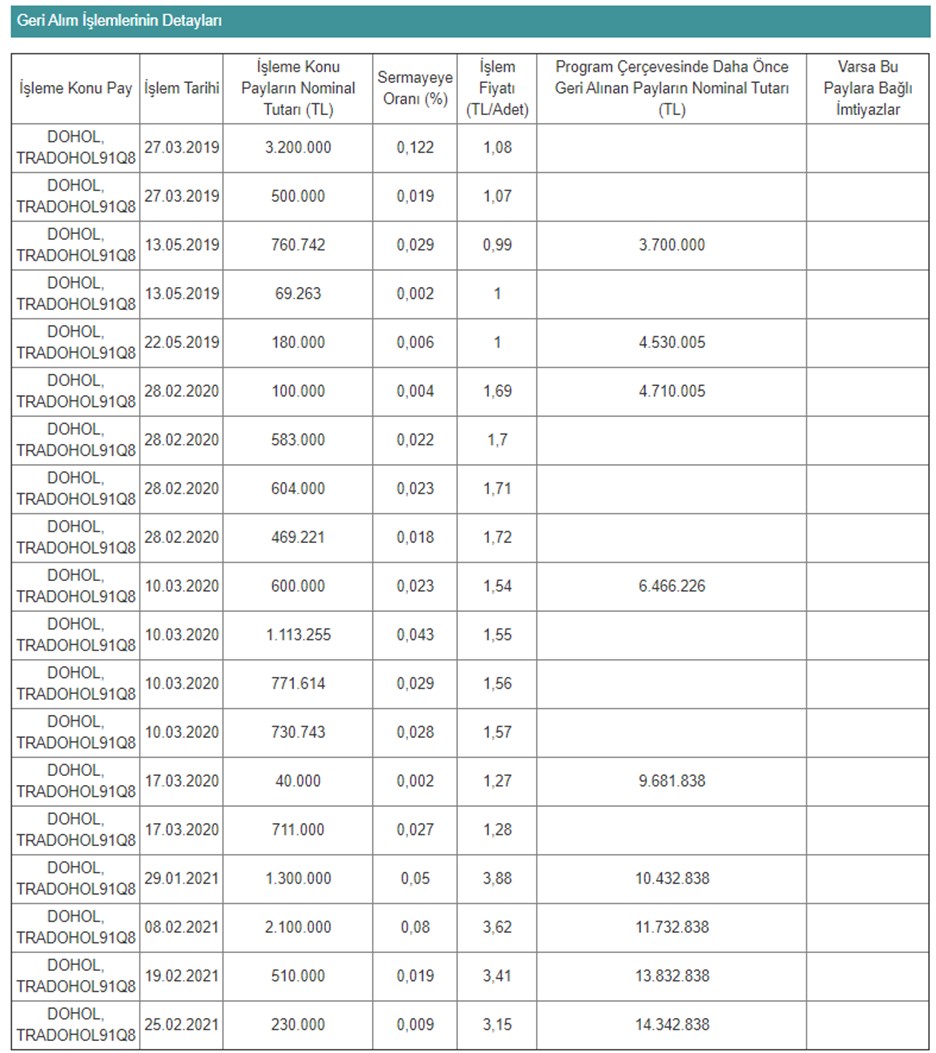 Şirketimiz 20 Mart 2019 tarihli Olağan Genel Kurul Toplantısında onaylanan "Pay Geri Alım Programı" kapsamında 25 Şubat 2021 (bugün) tarihinde 230.000 adet kendi payını Borsa'dan satın almıştır.