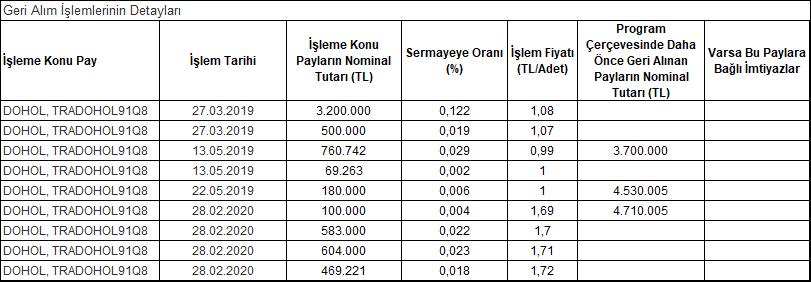 Şirketimiz 20 Mart 2019 tarihli Olağan Genel Kurul Toplantısında onaylanan "Pay Geri Alım Programı" kapsamında mevcut piyasa koşullarının yaratabileceği olumsuz etkileri dikkate alarak 28 Şubat 2020 tarihinde (bugün) 1.756.221 adet kendi payını Borsa'dan satın almıştır.