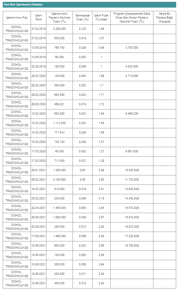 Şirketimiz 20 Mart 2019 tarihli Olağan Genel Kurul Toplantısında onaylanan "Pay Geri Alım Programı" kapsamında 18 Haziran 2021 tarihinde (bugün) 1.600.000 adet kendi payını Borsa'dan satın almıştır.