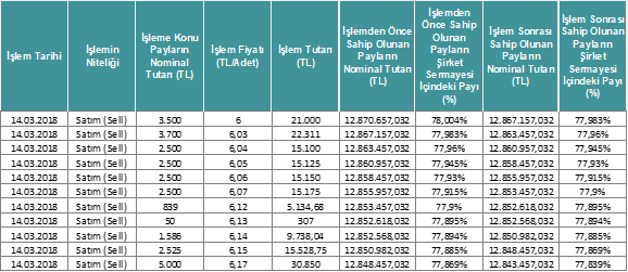 Şirketimiz' in doğrudan bağlı ortaklığı Çelik Halat ve Tel Sanayii A.Ş. hisselerinde 14.03.2018 tarihinde (bugün) yapmış olduğu işlemlere ilişkin tablo aşağıda yer almaktadır.