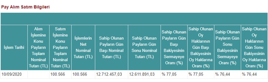 Şirketimiz, doğrudan bağlı ortaklığı Çelik Halat ve Tel Sanayii A.Ş. hisselerinde 10.09.2020 (bugün) tarihinde, 12,75 - 13,15 TL fiyat aralığından (ağırlıklı ortalama fiyat 12,94 TL) 100.566 adet satış işlemi gerçekleştirmiştir. Bu işlem ile birlikte Çelik Halat ve Tel Sanayii A.Ş. sermayesindeki payımız 10.09.2020 (bugün) tarihi itibariyle %76,44 olmuştur. Yapmış olduğumuz işlemlere ilişkin tablo aşağıda yer almaktadır;