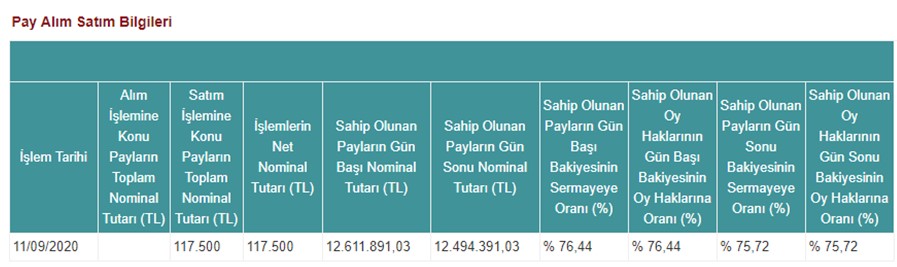 Şirketimiz, doğrudan bağlı ortaklığı Çelik Halat ve Tel Sanayii A.Ş. hisselerinde 11.09.2020 (bugün) tarihinde, 12,30 - 12,60 TL fiyat aralığından (ağırlıklı ortalama fiyat 12,44 TL) 117.500 adet satış işlemi gerçekleştirmiştir. Bu işlem ile birlikte Çelik Halat ve Tel Sanayii A.Ş. sermayesindeki payımız 11.09.2020 (bugün) tarihi itibariyle %75,72 olmuştur. Yapmış olduğumuz işlemlere ilişkin tablo aşağıda yer almaktadır;