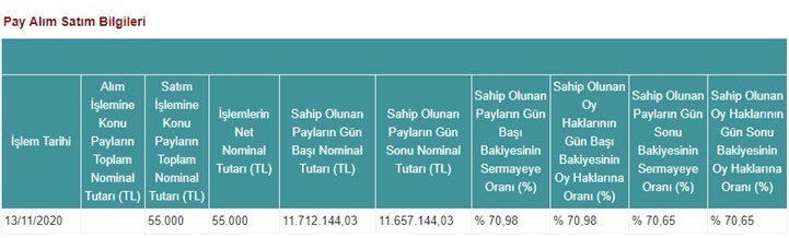 Şirketimiz, doğrudan bağlı ortaklığı Çelik Halat ve Tel Sanayii A.Ş. hisselerinde 13.11.2020 (bugün) tarihinde, 16,21 - 16,87 TL fiyat aralığından (ağırlıklı ortalama fiyat 16,51 TL) 55.000 adet satış işlemi gerçekleştirmiştir. Bu işlem ile birlikte Çelik Halat ve Tel Sanayii A.Ş. sermayesindeki payımız 13.11.2020 (bugün) tarihi itibariyle %70,65 olmuştur. Yapmış olduğumuz işlemlere ilişkin tablo aşağıda yer almaktadır;