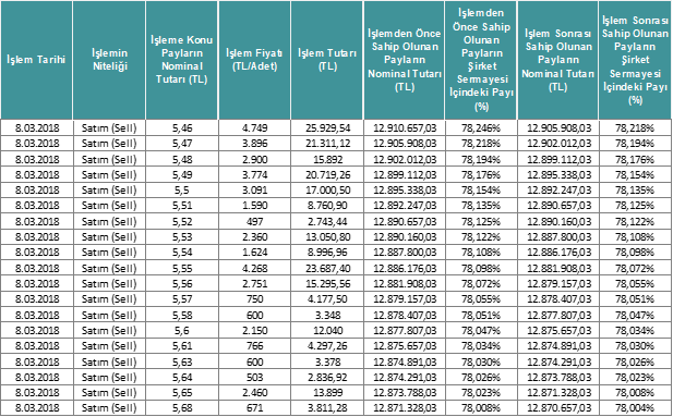 Şirketimiz' in doğrudan bağlı ortaklığı Doğan Gazetecilik A.Ş. hisselerinde 08.03.2018 tarihinde (bugün) yapmış olduğu işlemlere ilişkin tablo aşağıda yer almaktadır.