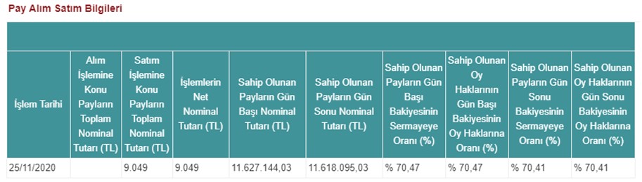 Şirketimiz, doğrudan bağlı ortaklığı Çelik Halat ve Tel Sanayii A.Ş. hisselerinde 25.11.2020 (bugün) tarihinde, 19,70 - 20,32 TL fiyat aralığından (ağırlıklı ortalama fiyat 20,00 TL) 9.049 adet satış işlemi gerçekleştirmiştir. Bu işlem ile birlikte Çelik Halat ve Tel Sanayii A.Ş. sermayesindeki payımız 25.11.2020 (bugün) tarihi itibariyle %70,41 olmuştur. Yapmış olduğumuz işlemlere ilişkin tablo aşağıda yer almaktadır;