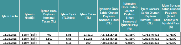 Şirketimiz' in doğrudan bağlı ortaklığı Ditaş Doğan Yedek Parça İmalat ve Teknik A.Ş. hisselerinde 15.03.2018 tarihinde (bugün) yapmış olduğu işlemlere ilişkin tablo aşağıda yer almaktadır.