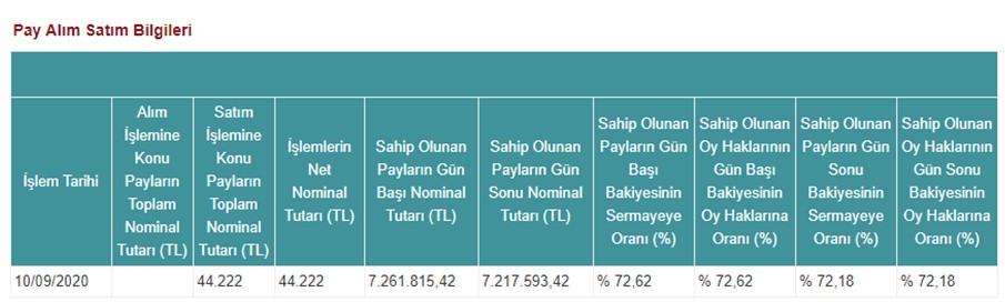 Şirketimiz, doğrudan bağlı ortaklığı Ditaş Doğan Yedek Parça İmalat ve Teknik A.Ş. hisselerinde 10.09.2020 (bugün) tarihinde, 39,86 - 43,80 TL fiyat aralığından (ağırlıklı ortalama fiyat 40,49 TL) 44.222 adet satış işlemi gerçekleştirmiştir. Bu işlem ile birlikte Ditaş Doğan Yedek Parça İmalat ve Teknik A.Ş. sermayesindeki payımız 10.09.2020 (bugün) tarihi itibariyle %72,18 olmuştur. Yapmış olduğumuz işlemlere ilişkin tablo aşağıda yer almaktadır;