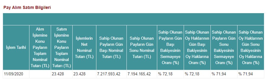 Şirketimiz, doğrudan bağlı ortaklığı Ditaş Doğan Yedek Parça İmalat ve Teknik A.Ş. hisselerinde 11.09.2020 (bugün) tarihinde, 35,70 - 37,44 TL fiyat aralığından (ağırlıklı ortalama fiyat 37,08 TL) 23.428 adet satış işlemi gerçekleştirmiştir. Bu işlem ile birlikte Ditaş Doğan Yedek Parça İmalat ve Teknik A.Ş. sermayesindeki payımız 11.09.2020 (bugün) tarihi itibariyle %71,94 olmuştur. Yapmış olduğumuz işlemlere ilişkin tablo aşağıda yer almaktadır;